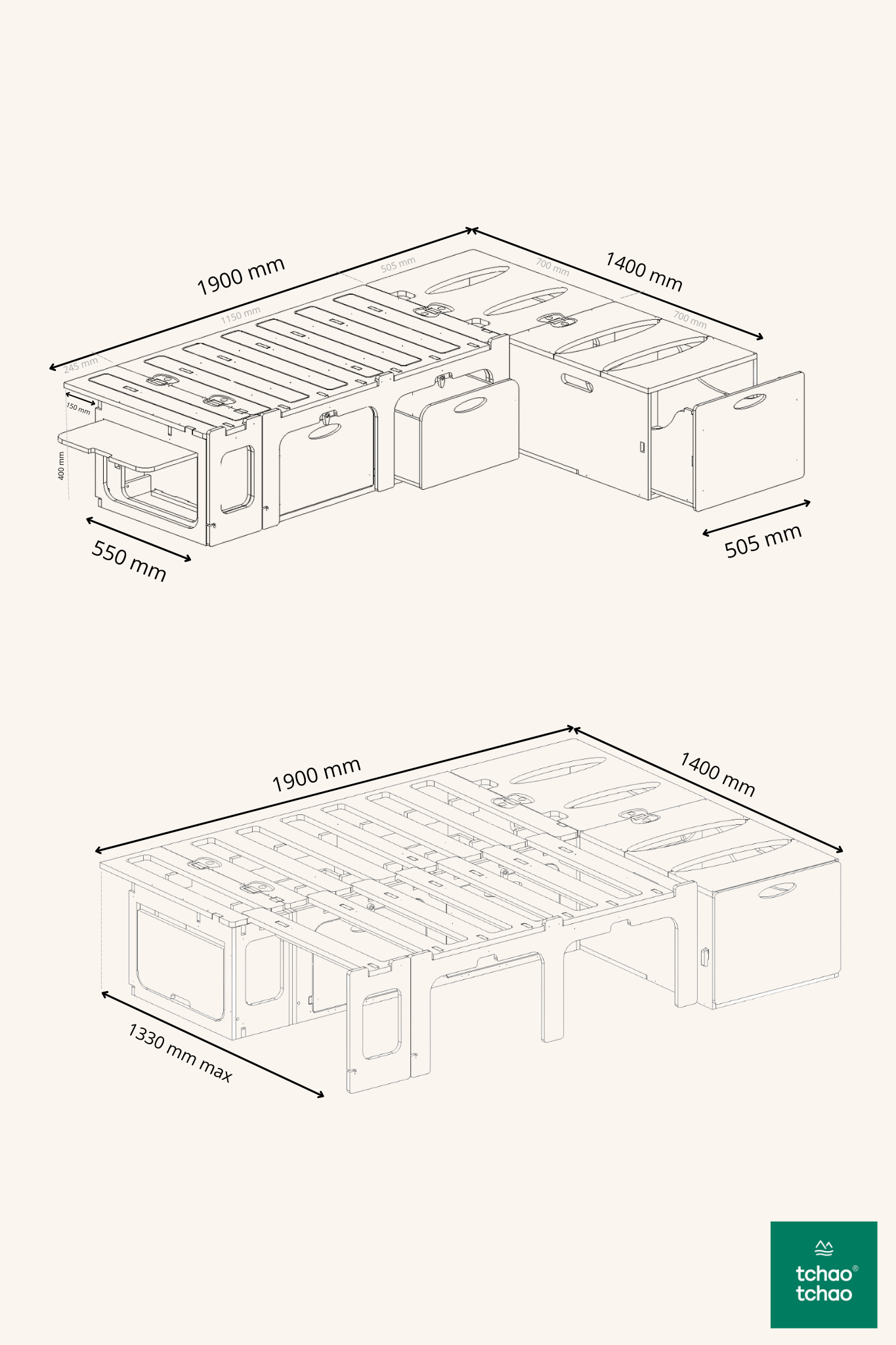 Verwandeln Sie Ihren Van in einen komfortablen und funktionalen Wohnraum mit diesem cleveren Set von Tchao Tchao. Gefertigt aus nachhaltig angebautem Pappelsperrholz aus dem Pays de la Loire, vereint es Modularität, Praktikabilität und minimalistisches Design – für ein einfaches und geniales Vanlife.